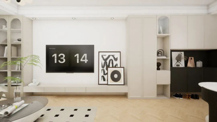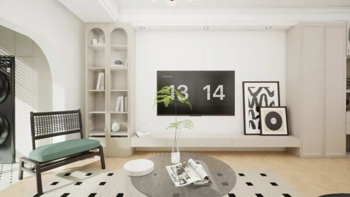 电视墙的设计也颇具巧思,嵌入式的收纳柜与装饰画结合,既满足了收纳需求,又成为了一处别致的视觉景观。