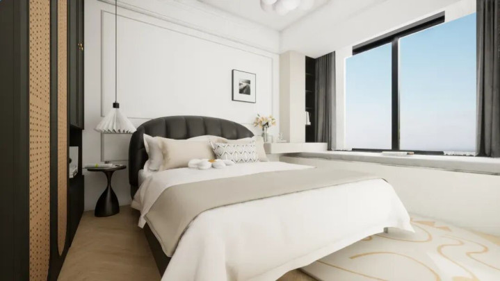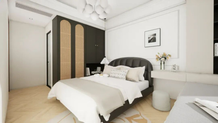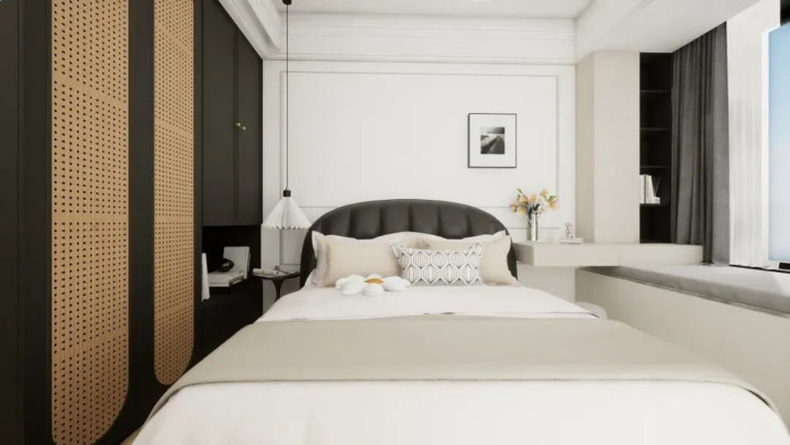 走进主卧,仿佛踏入了一个复古的温柔乡。黑色的皮质床头,带着浓浓的复古腔调,搭配米白色的床品和带有几何图案的抱枕,让睡眠空间既有质感又不失温馨。