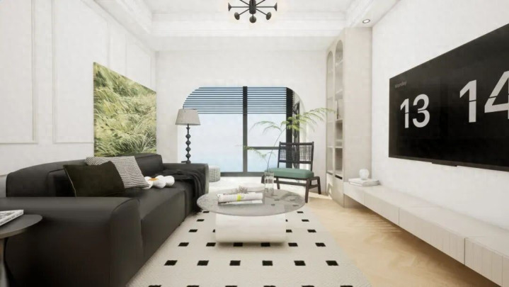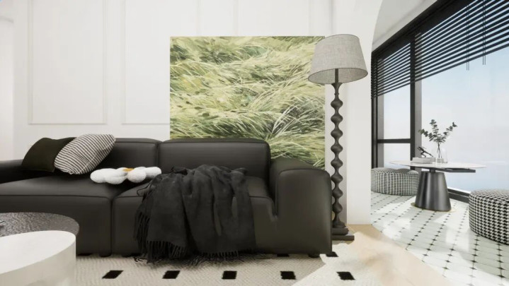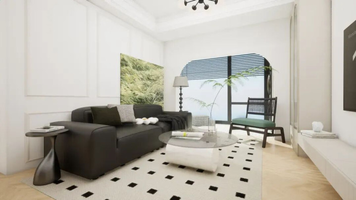 地面的黑白方块地毯,是法式复古的经典元素,它不仅划分了空间,更在视觉上延伸了层次。而那盏造型独特的黑色落地灯,如同艺术雕塑般矗立,为客厅增添了几分艺术气息。