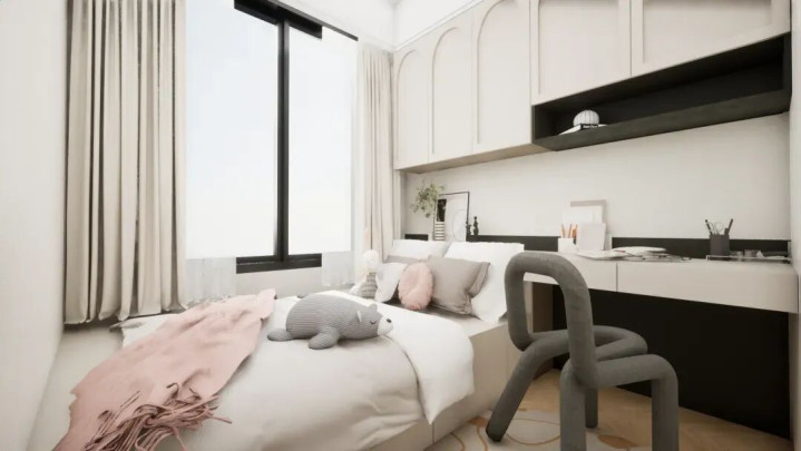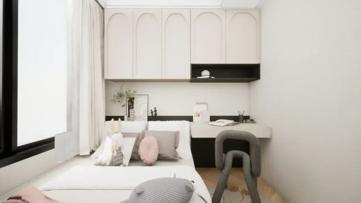 次卧的设计充满了巧思,它既是卧室,也是一处可以静心工作的空间。浅灰色的床品温馨舒适,床头的装饰画为空间增添了艺术气息。与床相连的是一个一体化的书桌,白色的台面搭配黑色的柜体,简洁又实用。
