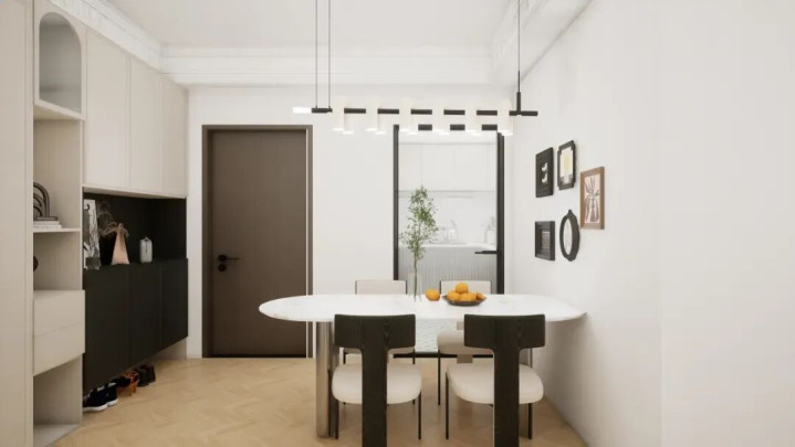 一旁的柜子做了玄关柜和餐边柜一体设计,开放式的格架可以摆放装饰品,封闭式的柜体则能收纳餐具杂物,让餐厅既美观又实用。
