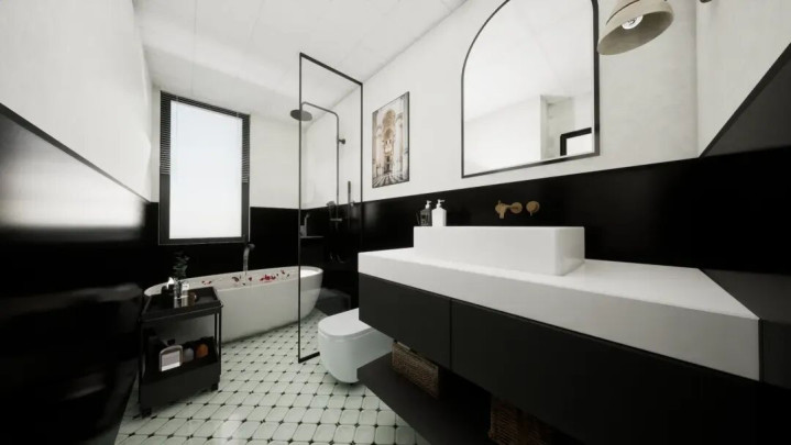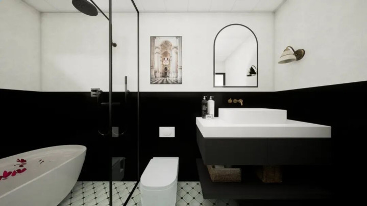 最后是卫浴空间,黑白的经典配色带来满满的复古精致感。黑色的墙面与白色的墙面形成鲜明对比,搭配带有花纹的地砖,法式复古的韵味十足。