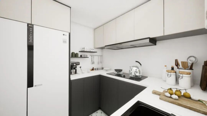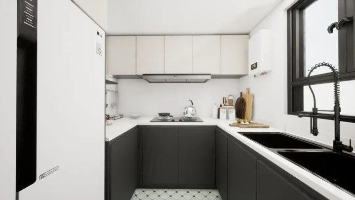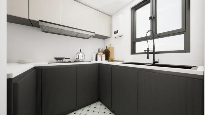 厨房是复古与实用并存的烹饪天地 ,也是复古与实用并存的烹饪天地。白色的橱柜搭配黑色的地柜,经典的配色让厨房显得干净利落。